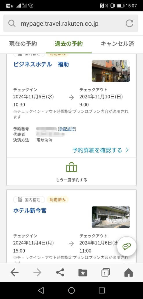 他にも予約サイトはたくさんあって、Booking.com、一休、じゃらんとか色々見たけど楽天トラベルの方が予約が取りやすくて他サイトよりも宿泊料が安いのが多かったからずっと楽天使ってました。