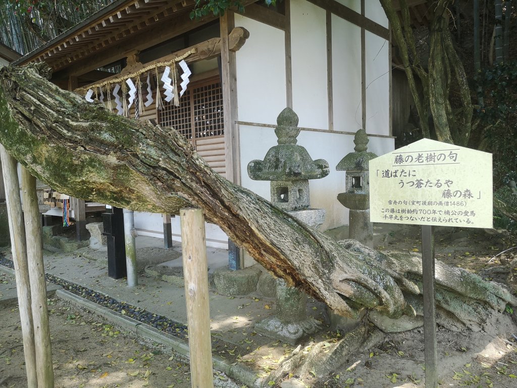 建武(けんむ)元年(1334年)、観心寺(現大阪府河内長野市寺元)にいた楠木正成が後醍醐天皇の鎌倉幕府の討伐の途中、馬の千早丸(ちはやまる)の腰が立たなくなり、神社の藤の木につないでお祈りしたところ腰が治ったとある。