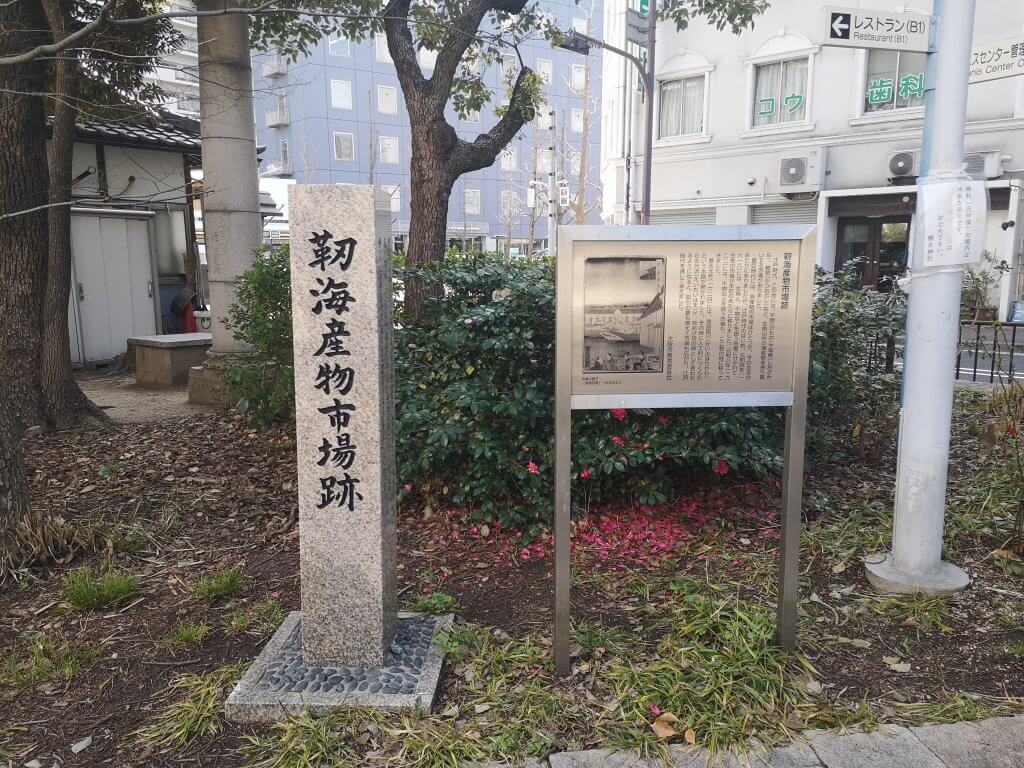 敷地内に靭海産市場跡の石碑と看板が建っている。