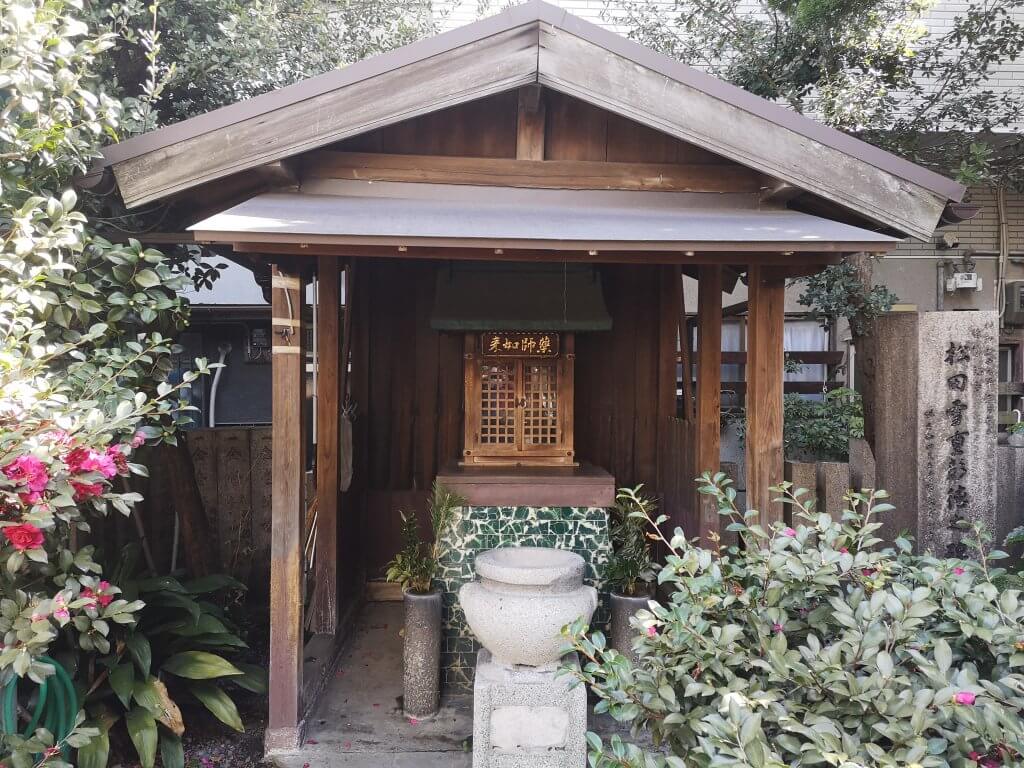 松之木大明神はコンパクトな敷地ながらも、稲荷神、薬師如来、猫塚、近松門左衛門の石碑が祀られていた。
